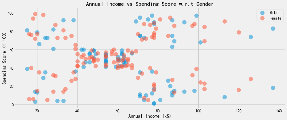 此段代码执行后,会有1张统计图,以性别为参照,展示了收入和消费指数之间的对应统计关系