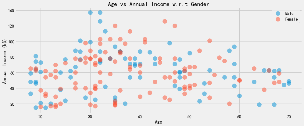 data = df[df['Gender'] == gender] ,s = 200 , alpha = 0.5 , label = gender)