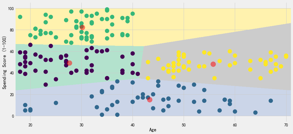 我们把4个聚类中心的聚类结果,以下图进行展示。横坐标是年龄,纵坐标是消费指数,4个红点为4个聚类中心,4块不同颜色区域就是4个不同的用户群体。