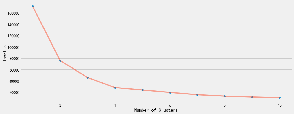 观察10次聚类的inertias,并以如下折线图进行统计。