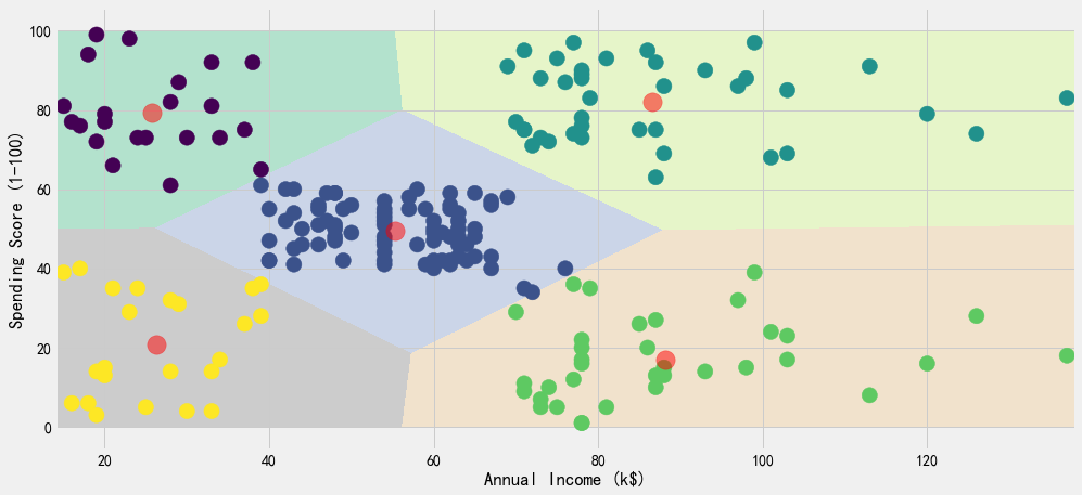 我们把5个聚类中心的聚类结果,以下图进行展示。横坐标是年收入,纵坐标是消费指数,5个红点为5个聚类中心,5块不同颜色区域就是5个不同的用户群体。