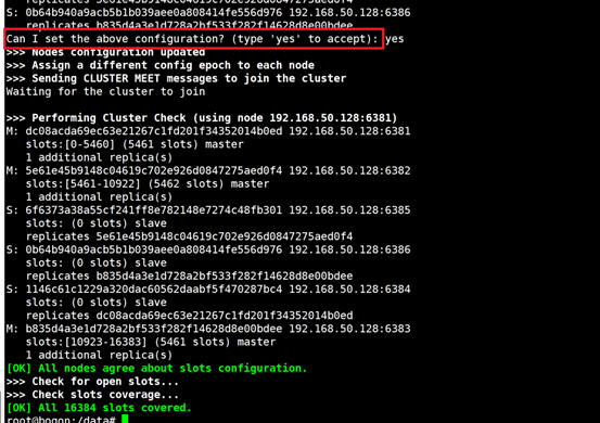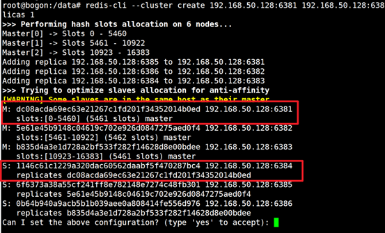 redis-cli --cluster create 192.168.50.128:6381 192.168.50.128:6382 192.168.50.128:6383 192.168.50.128:6384 192.168.50.128:6385 192.168.50.128:6386 --cluster-replicas 1