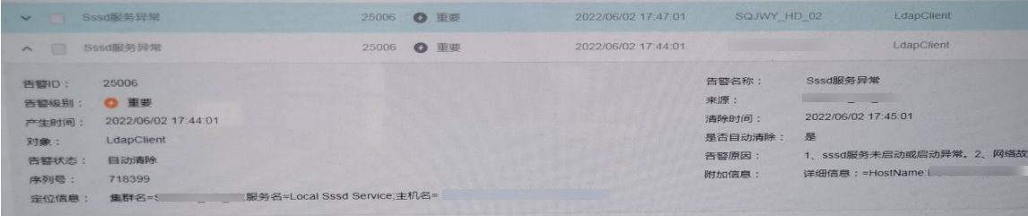 - 用户有表的查询权限查询时还报错用户没有权限,怀疑个别节点可能鉴权失败,检查manager页面发现两个节点存在sssd服务异常告警;