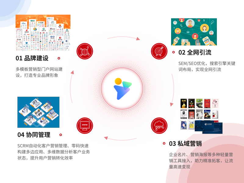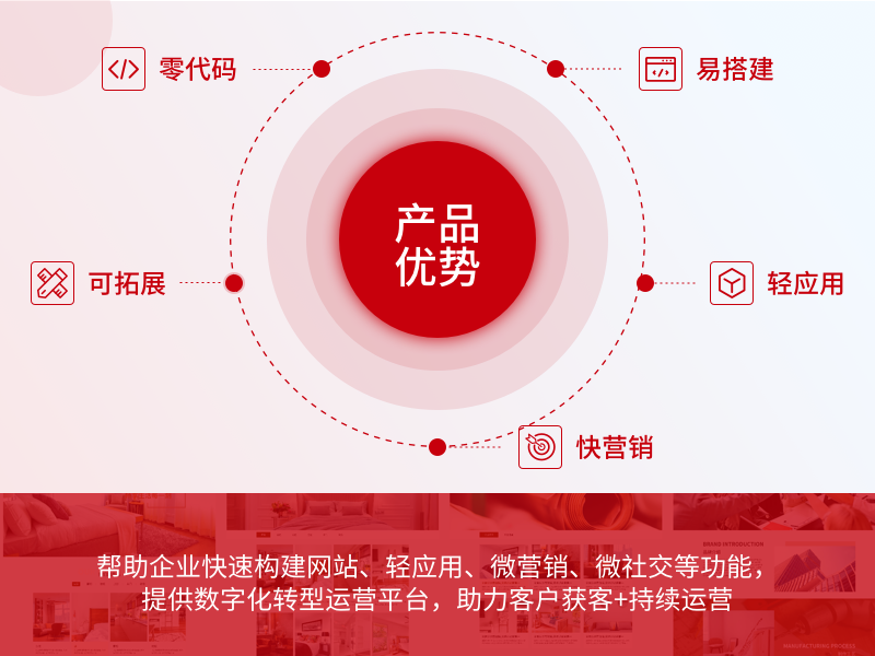 总体来说,平台基于建站系统,集成了人工智能技术、零码开发能力、营销引流轻应用的SaaS服务,帮助用户快速建站(网站+APP+小程序)、精准营销引流,高效提升获客转化效率,实现“信息展示、互动、交易、推广引流、品牌提升、整合营销为一体”的效果,让企业营销更简单,助力企业完成数字化运营转型新突破。