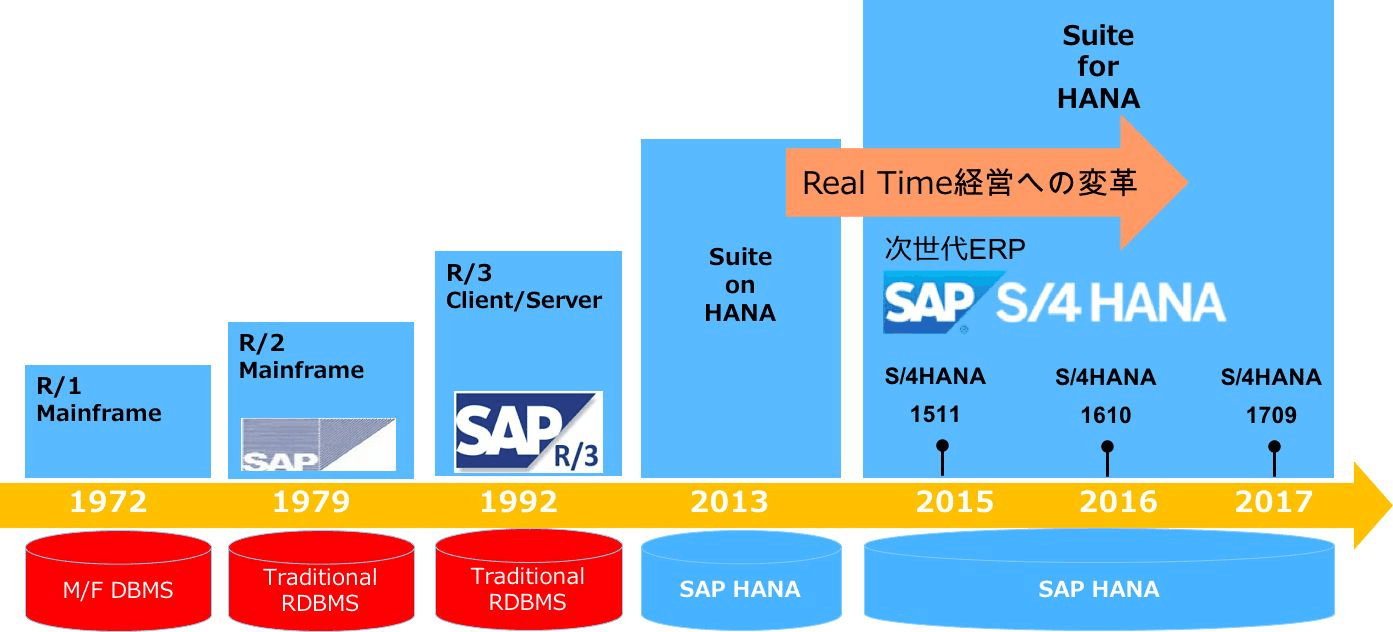 SAP的产品自1972年至今已发布了很多代版本,其发展历程和产品架构演化大约如下图所示: