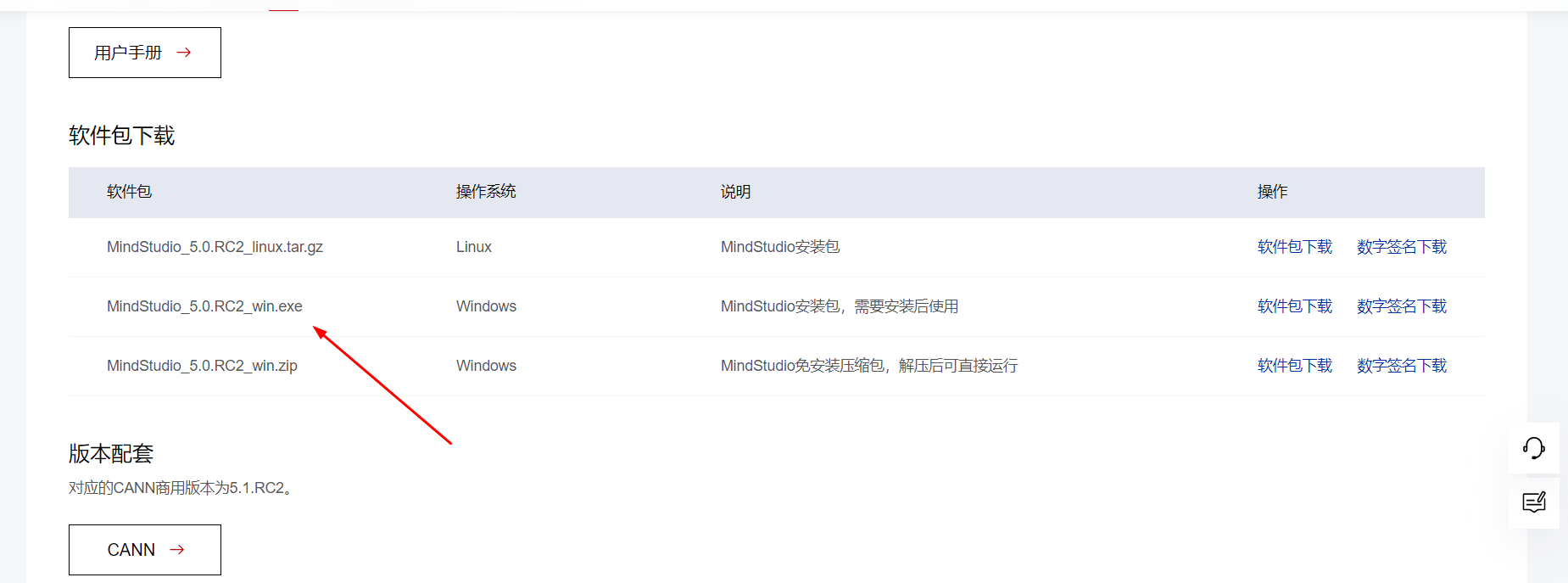 然后我们进入版本选择界面,可以根据自己的操作系统、安装方式选择不同的软件包,我们这里选择的是 MindStudio_5.0.RC2_win.exe,进行下载安装。