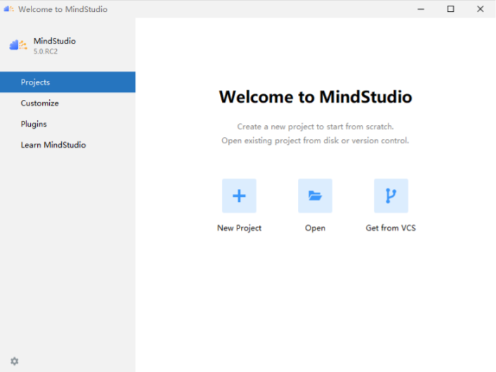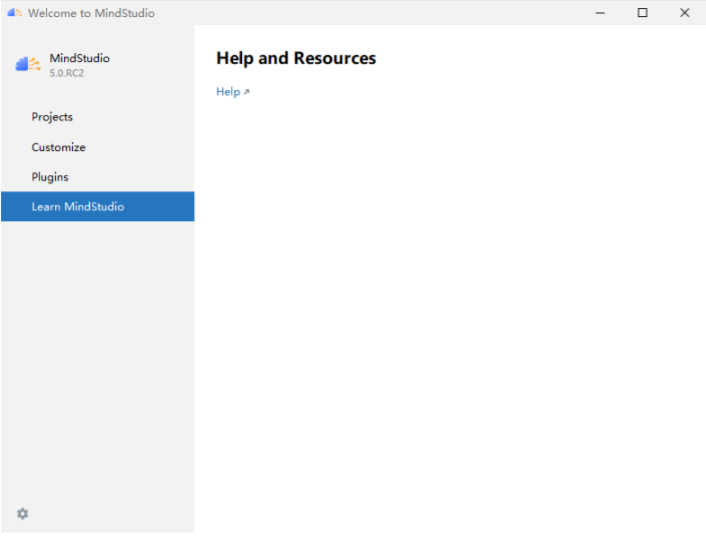 Learn MindStudio 标签可以通过点击“Help”进入官方社区获取帮助。在 Projects 标签下点击“New Project”创建一个新的工程。