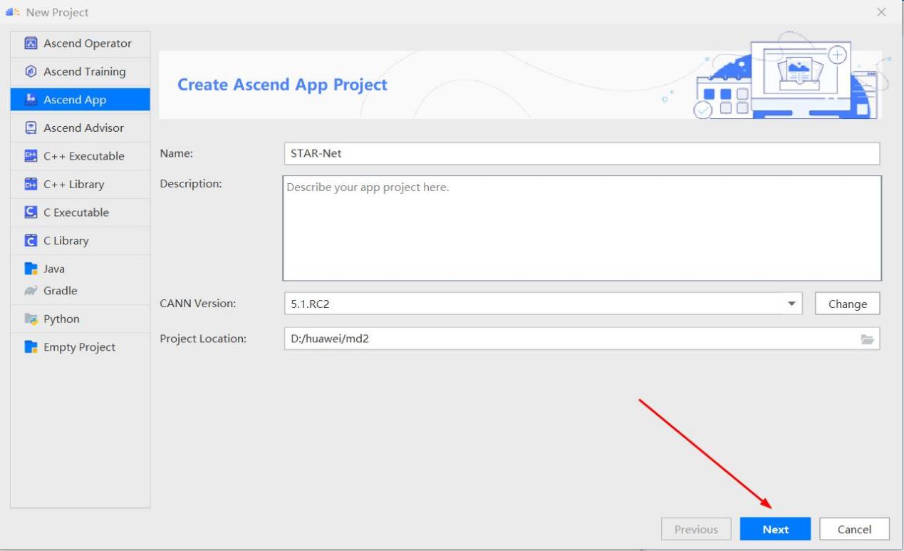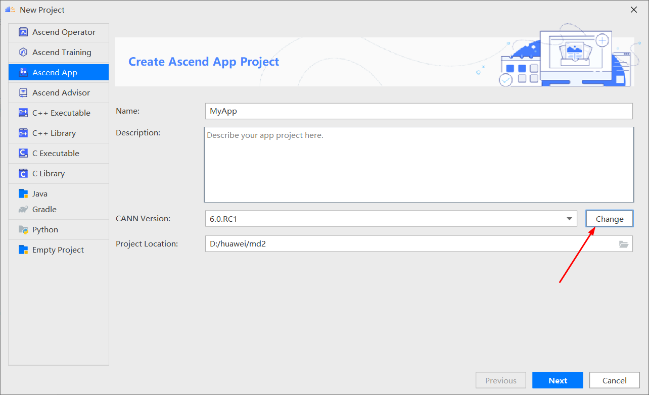 选择 Ascend App,输入工程名、和工程目录,点击“Change”选择或者添加 CANN 版本。