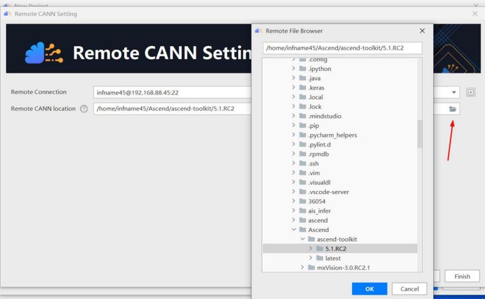 点击文件夹图标,在弹出的对话框中选择 CANN 安装路径,点击“OK”。