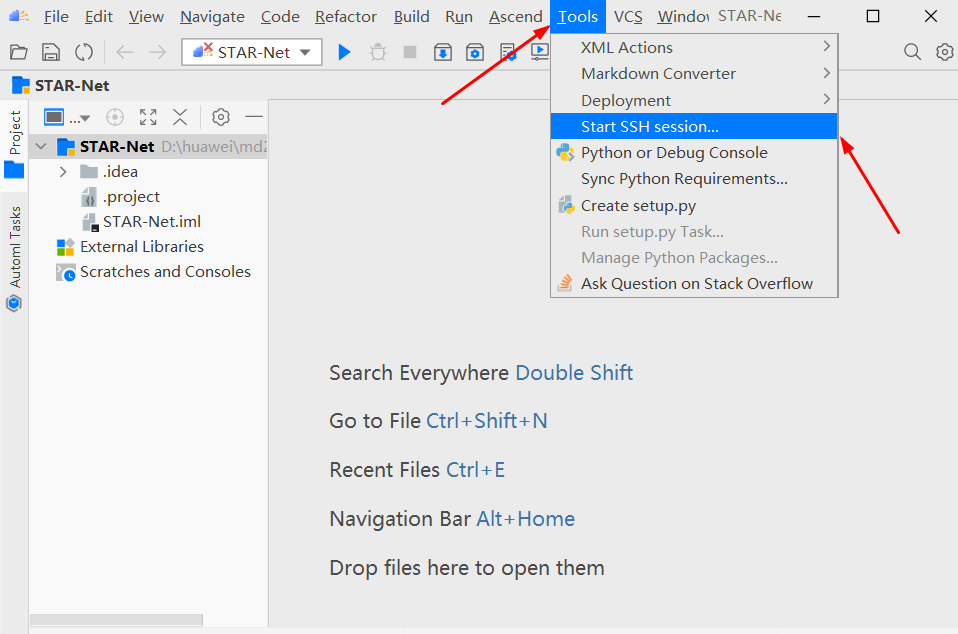 点击“Tools”->“Start SSH session”。选择远程环境,启动远程终端窗口。