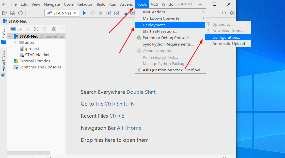 点击“Tools”->“Deployment”->“Configuration”。