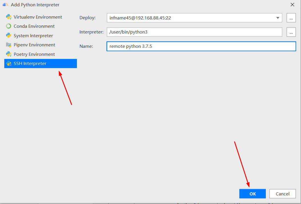 点击“SSH Interpreter”,自动识别远程 Python 环境信息,点击“OK”。