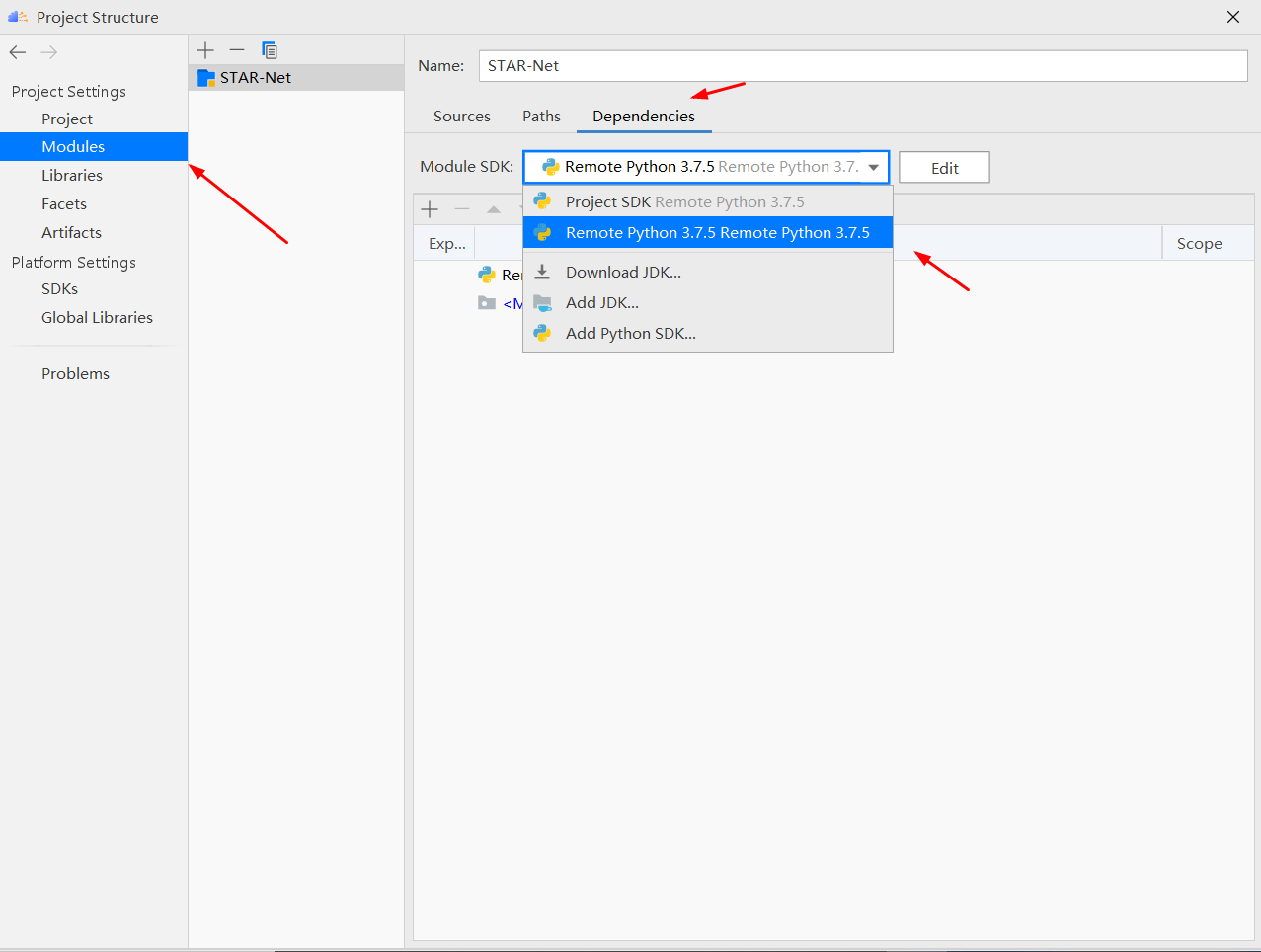 点击“Modules”->“Dependence”,选择创建的 SDK,点击“OK”。