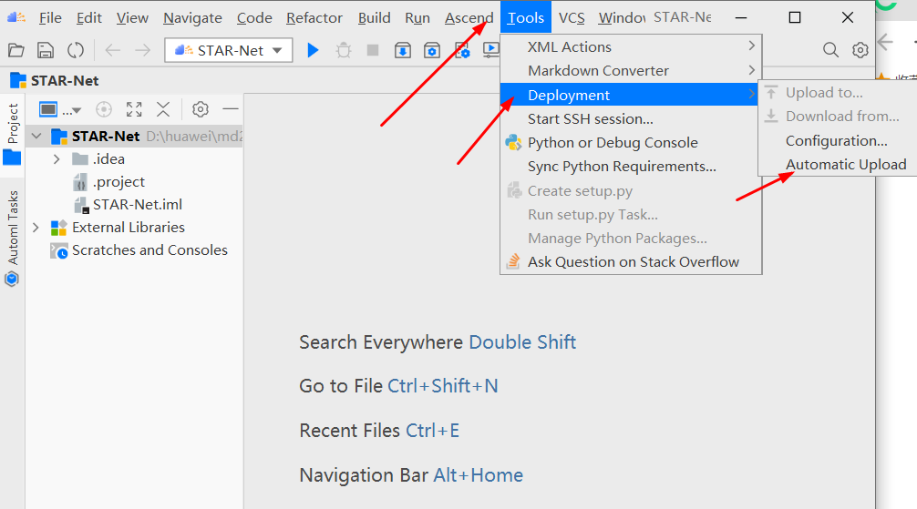 点击“Tools”-> “Deployment”->“Automatic Upload”。