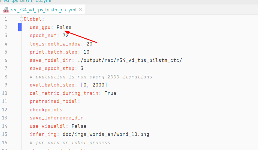 b.修改模型配置文件 配置不使用 gpu 和英文字母字典路径,如下图。Gpu:true改为false