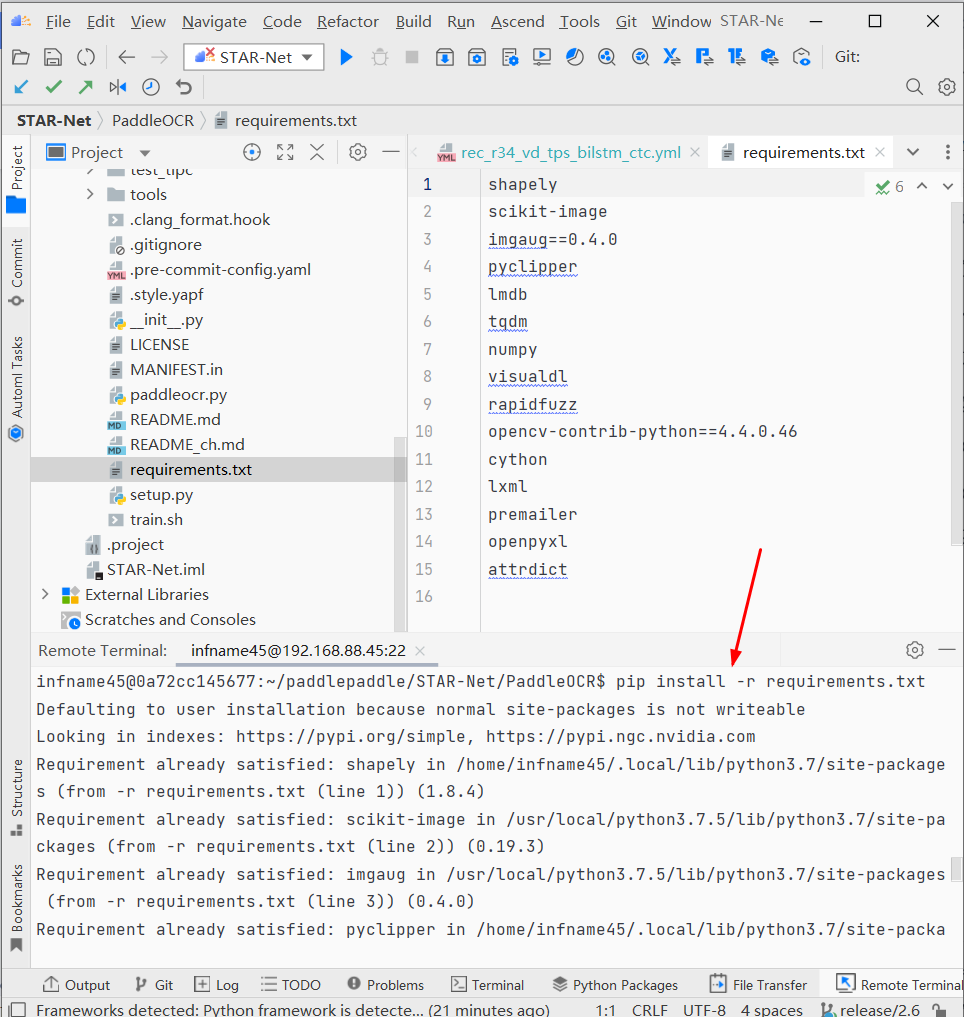 执行命令如下:pip3 install -r requirements.txt [--user],普通用户安装需添加--user参数。通过以上步骤,成功获取star_net模型的源代码框架,以及配置运行依赖环境。