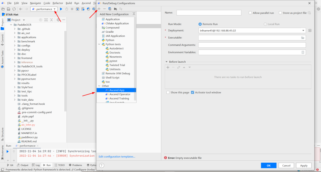 在使用 MindStudio 过程中,发现执行完远程命令后,会出现如下图所示的 错误,该错误指同步远程文件到本地时出现了错误,经过定位发现项目中包含带 有中文的文件名,因此需要将带有中文的文件名称改为英文文件名即可解决该问 题。