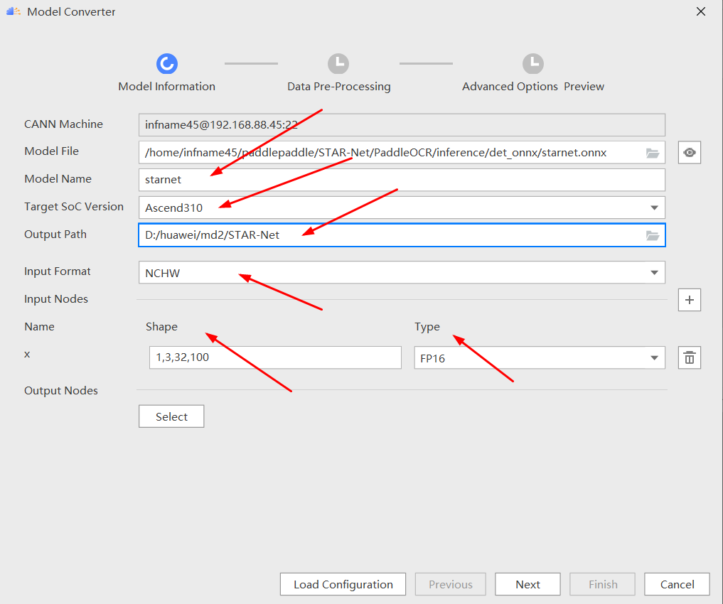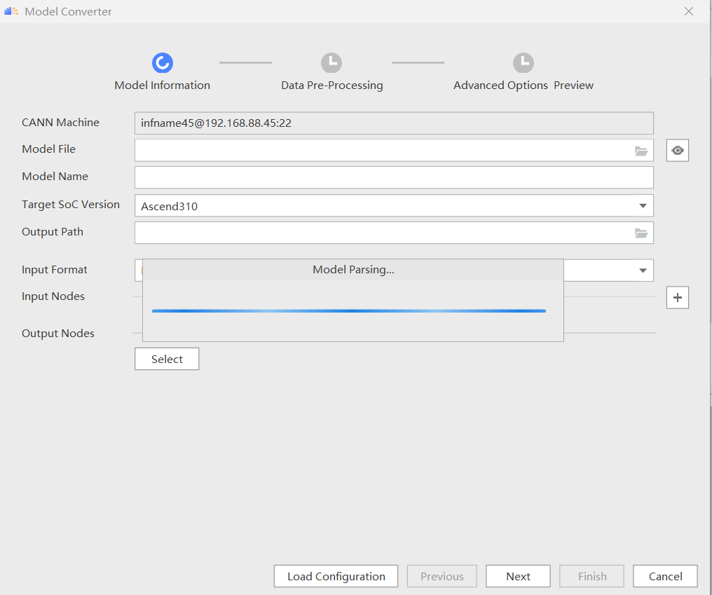 d.解析完成后,设置模型名称、soc 版本、om 模型生成目录、通讯模型的 Input Format、Shape、Type 信息,点击“Next”。