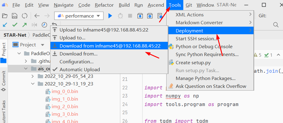 目录下的ais_infer.py文件和 frontend 文件夹复制到工程根目录下, 并将修改的文件依次上传到远程服务器,如下图所示。