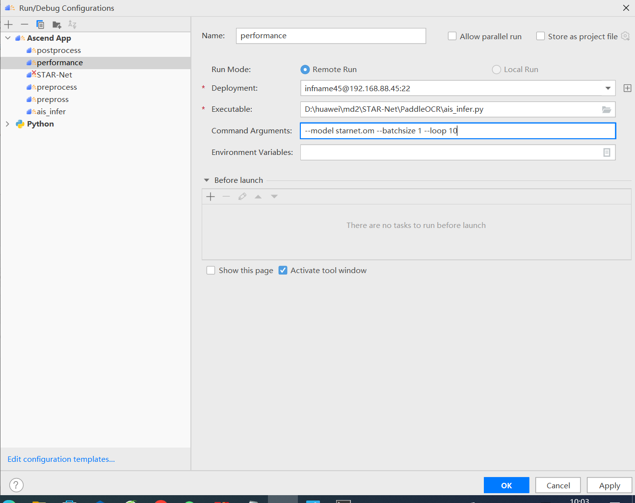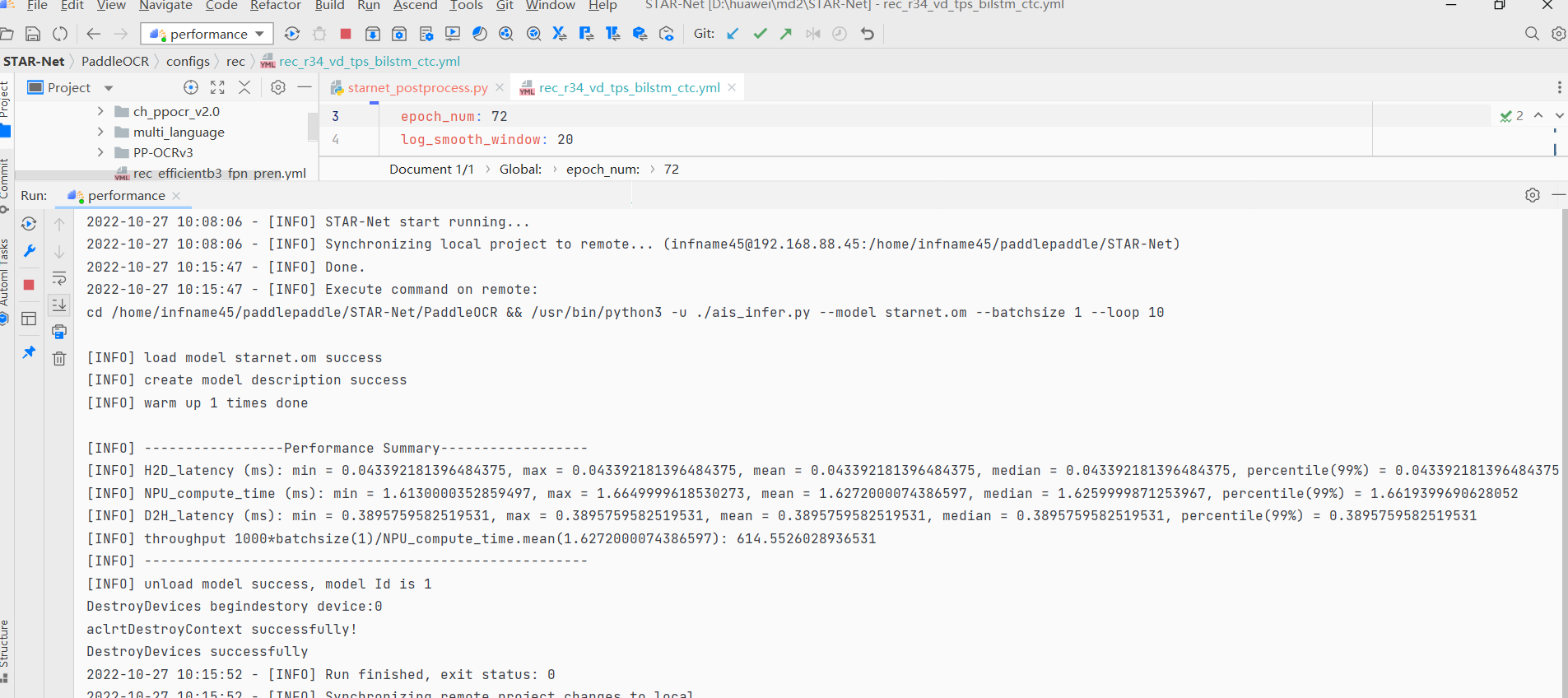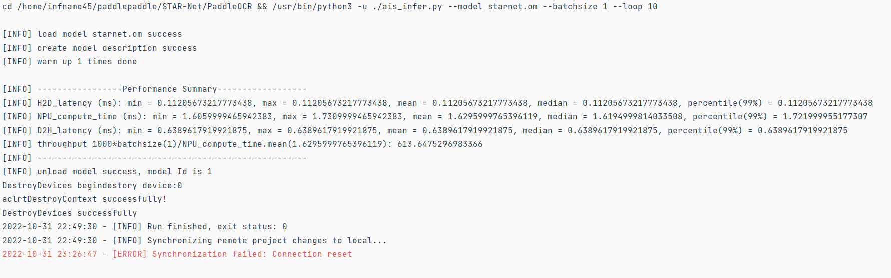 命令:python3.7 ais_infer.py --model starnet.om --batchsize 1 --loop 10