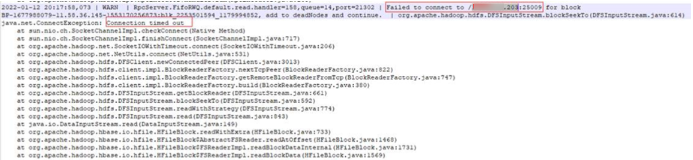 - 分析regionserver日志所有打印查询业务表的scan请求的responseTooSlow信息前都有连接x.x.x.203节点dn实例失败的日志;