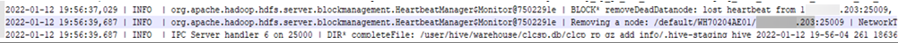 【摘要】 【问题描述】HBase业务查询超时。【分析过程】 分析regionserver日志所有打印查询业务表的scan请求的responseTooSlow信息前都有连接x.x.x.203节点dn实例失败的日志;检查对应的dn日志,dn实例进程在19:44:41停止,21:18:19启动,根据一线反馈该节点因为告警节点故障19:44做了主机隔离;根据nn日志分析19:56:39 nn将隔离节点dn实例...