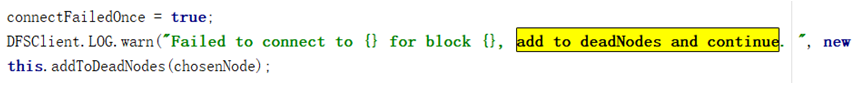 - dn节点故障后DFSInputStream中缓存的block信息在没有请求到该block时是不会更新的,所以读取时还是会连接到故障dn节点,连接失败后才会去nn中获取其他块的位置。