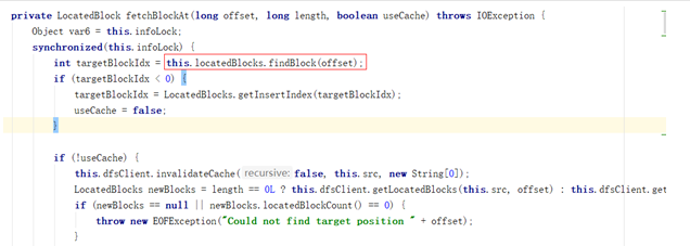 - 查询时会调用fetchBlockAt方法获取block位置,优先到DFSInputStream缓存中查找(缓存在regionserver侧,HDFS客户端的缓存),找不到再到namenode去获取同时更新缓存中datanode的信息数据。