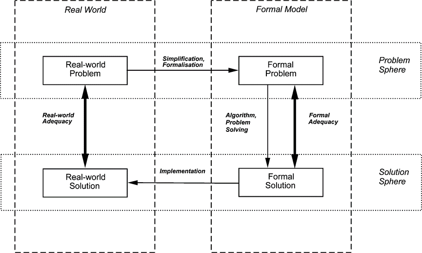 值得注意的是,调度不仅用于生成要执行的详细计划,还可用于为公司的不同业务职能提供信息来源。例如,它可能用于为物料需求计划(MRP)系统提供产能检查,或帮助对来自客户的新订单进行排序,或决定其接受/拒绝。同样,我们可以看到调度与其他业务功能之间的密切关联,而且调度与这些功能之间的区别常常会模糊。讨论调度功能是否比质量管理、供应链协调或产品设计更重要(举几个运营管理决策的例子)对于任何实际目的来说都是无用的讨论。很明显,如果没有整体良好的运营管理,无论调度功能执行得多么好,更好的调度都无助于提高公司的业绩,不同的决策也是如此。然而,应该清楚的是,调度是工业公司的核心业务决策。为了突出与调度决策相关的主要问题,我们在图中描绘了决策过程的众所周知的流程,至少对于可量化的决策问题:从需要决策的现实世界问题开始,通过简化和形式化的方式导出了形式化模型。通过使用某种形式化的程序或算法,解决了该形式化模型,即导出了该问题的形式化解决方案。然后,在实现过程中,这个正式的解决方案被转换为现实世界的解决方案,该解决方案被实现用于解决现实世界的决策问题。图示的方案相当基础和肤浅,几乎可以将其复杂化到每个层次。我们只提及这种简化,因为它描述了与制造调度决策相关的基本问题。