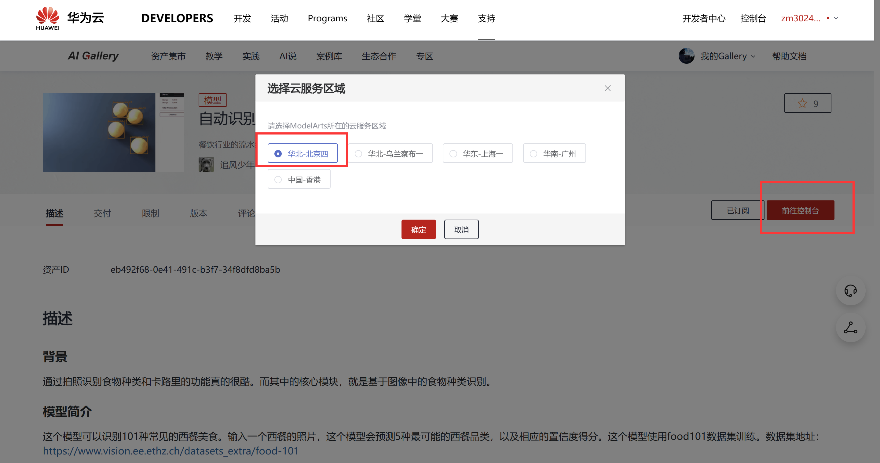 点击前往控制台并选择华北-北京四(后续涉及到云服务区域选择的均需选择此选项)