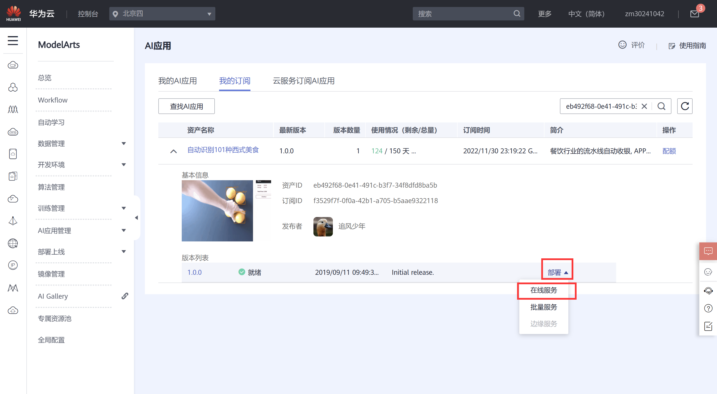 确定后会自动跳转到 ModelArts 控制台的 AI 应用订阅界面,查看到我们订阅的这个模型,第一次需要等模型同步完成后才能继续,同步约1分钟。