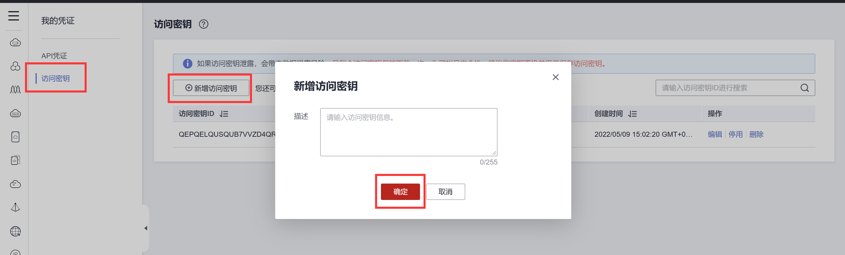 登录华为云账号后,点击右上角的用户名,在下拉菜单中选择“我的凭证”,进入我的凭证页面后,选择左侧的“访问秘钥”菜单,然后点击“新增访问秘钥”,按要求输入相关信息,有时候会有一个弹出框进行短信验证码认证,认证成功后即可下载秘钥信息。