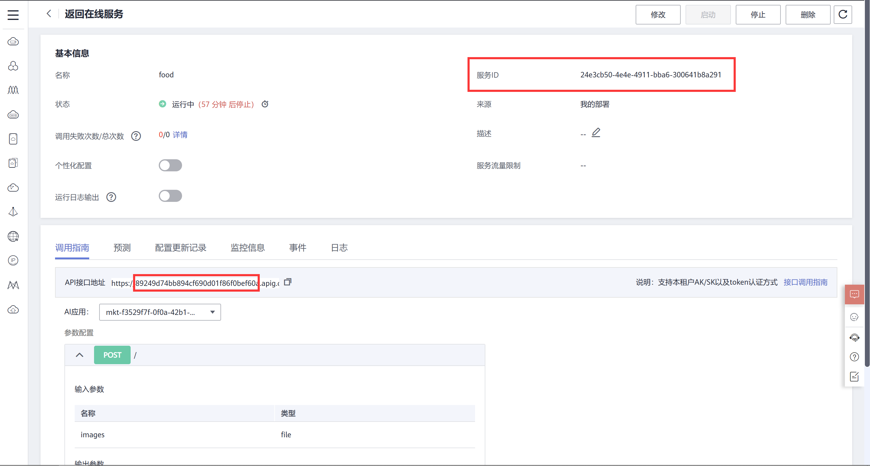 部署完成后如下所示,点击下方的“调用指南”tab页按钮,即可看到本服务的API接口,注意图中的API接口地址和服务ID,第4章《创建ModelArts连接器》会用到。