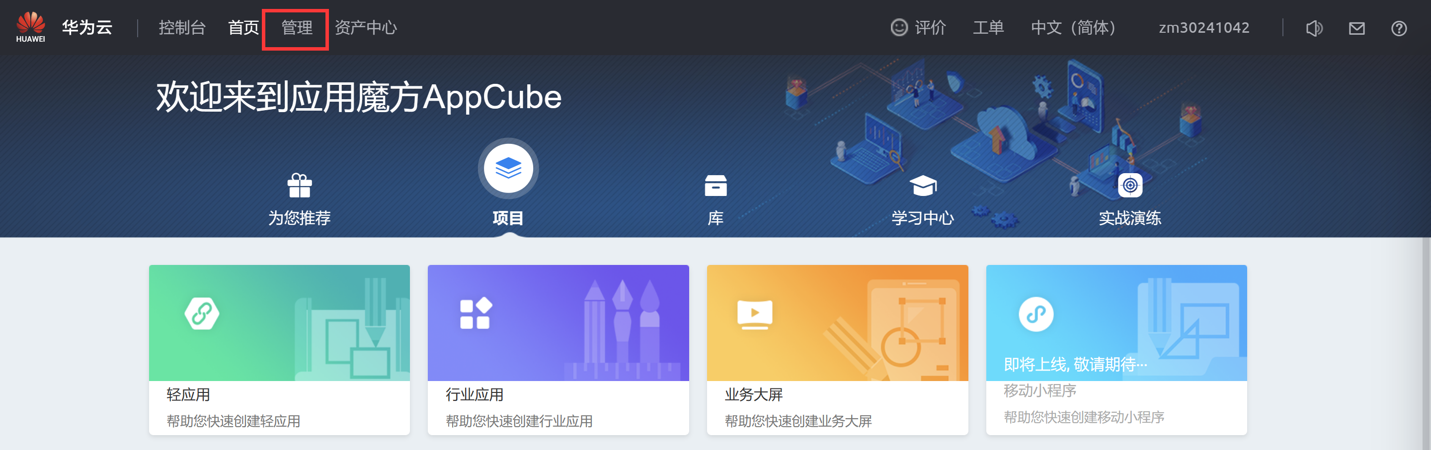 本次体验使用免费版 AppCube 即可完成,点击https://console.huaweicloud.cn/appcube/?region=cn-north-4,打开控制台,点击右上角的的“免费试用”按钮,按照提示操作,完成免费版的资源领取。