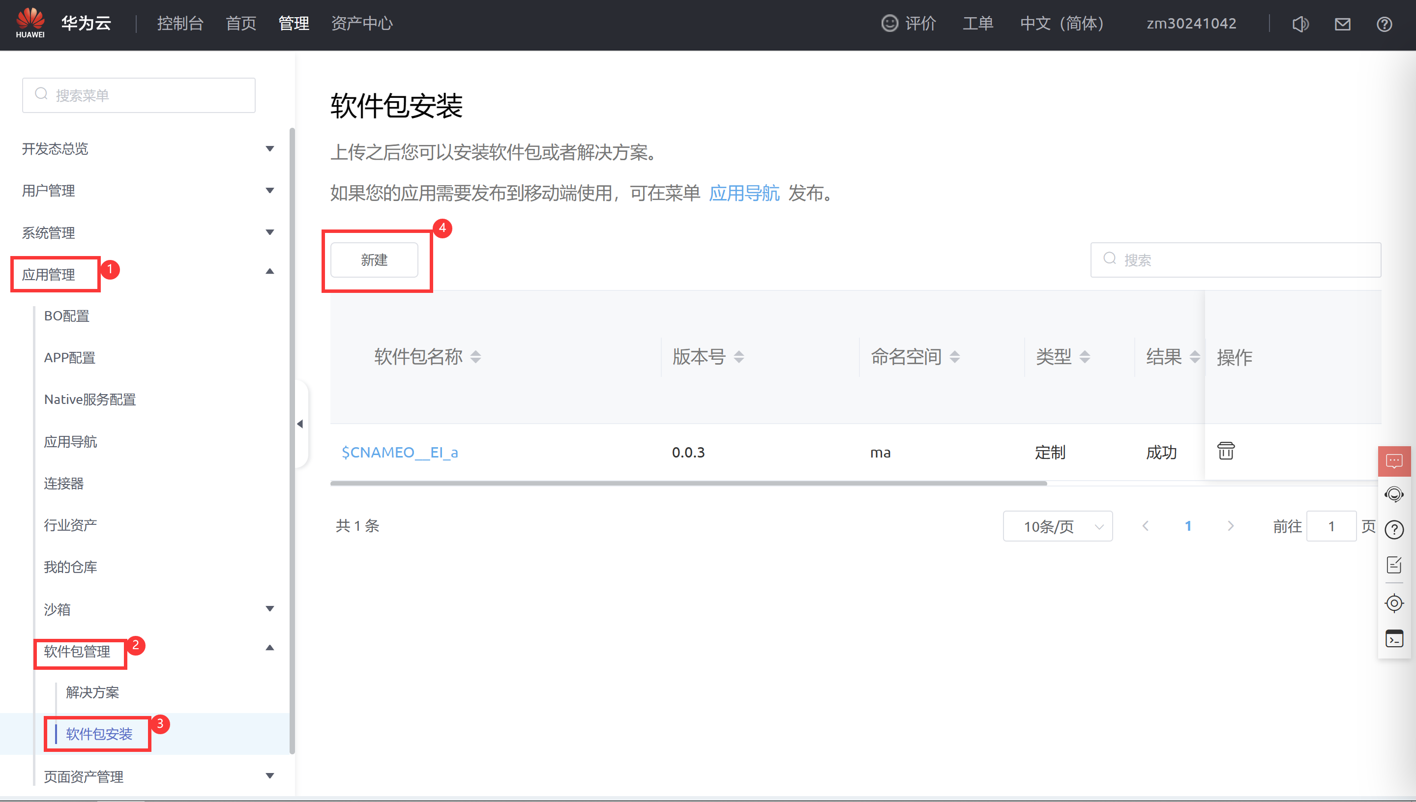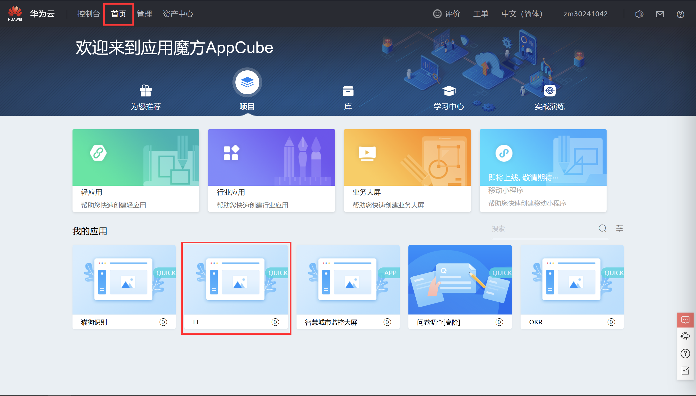 上传成功后,返回后首页,可以看到刚刚导入的应用,默认名字“EI”。