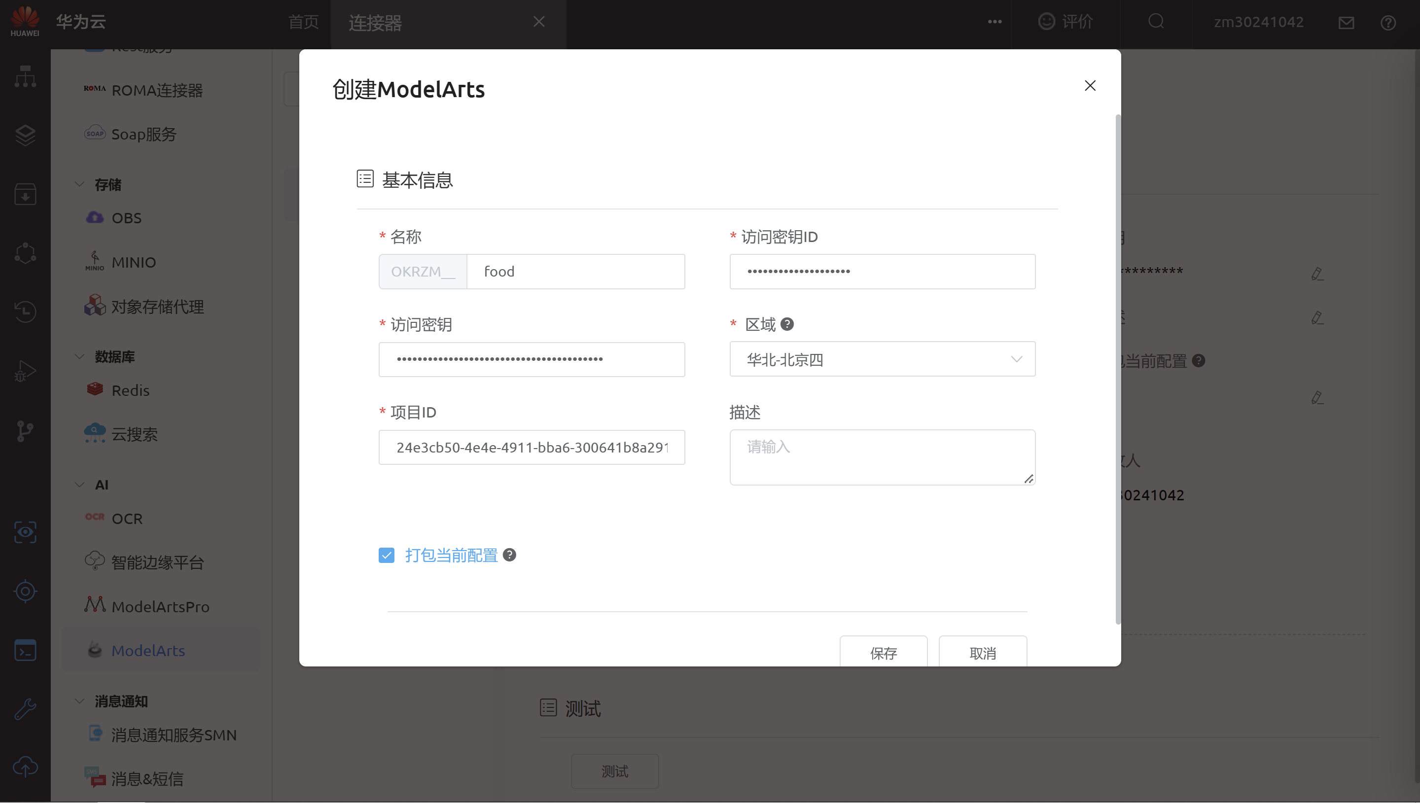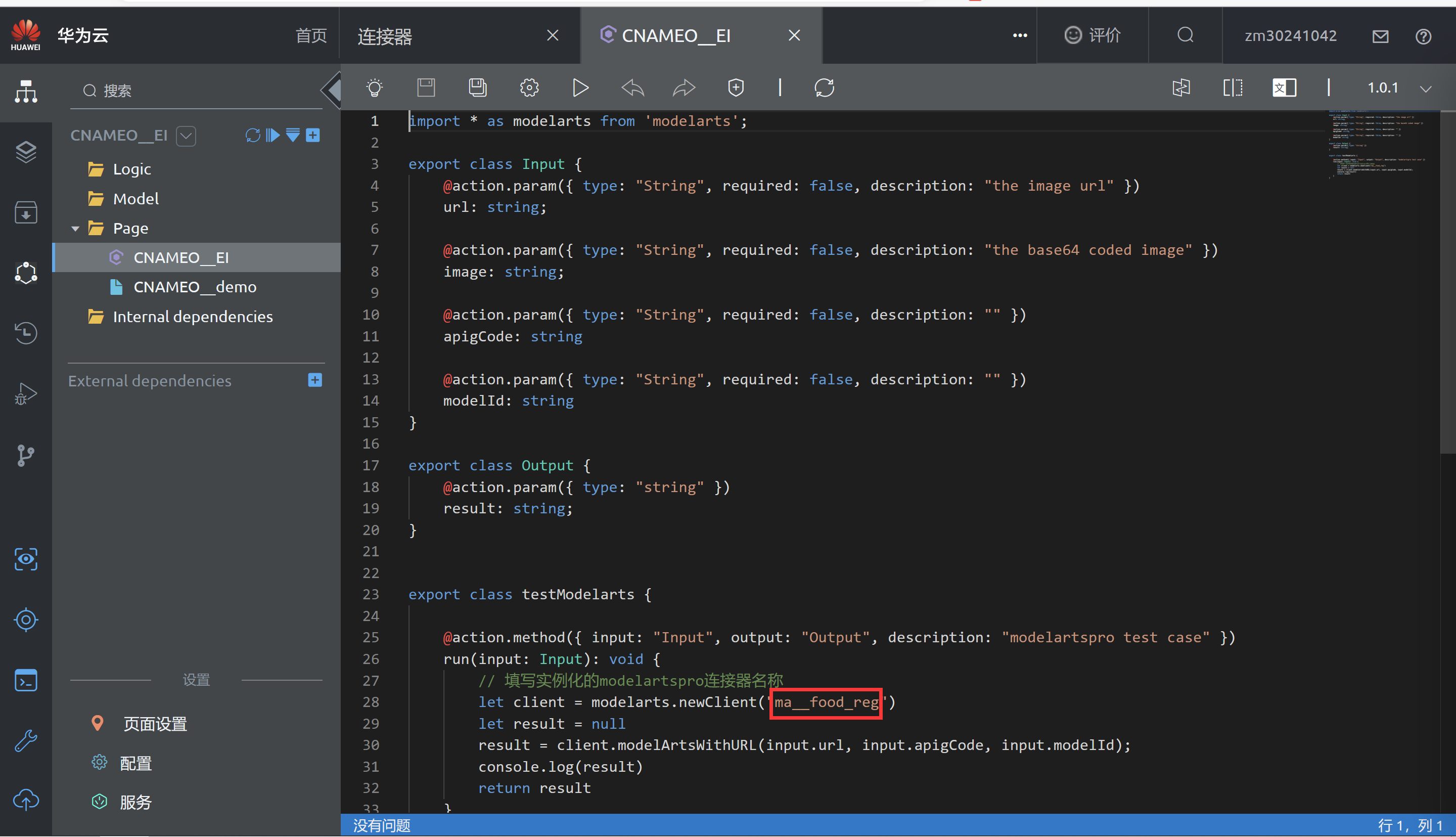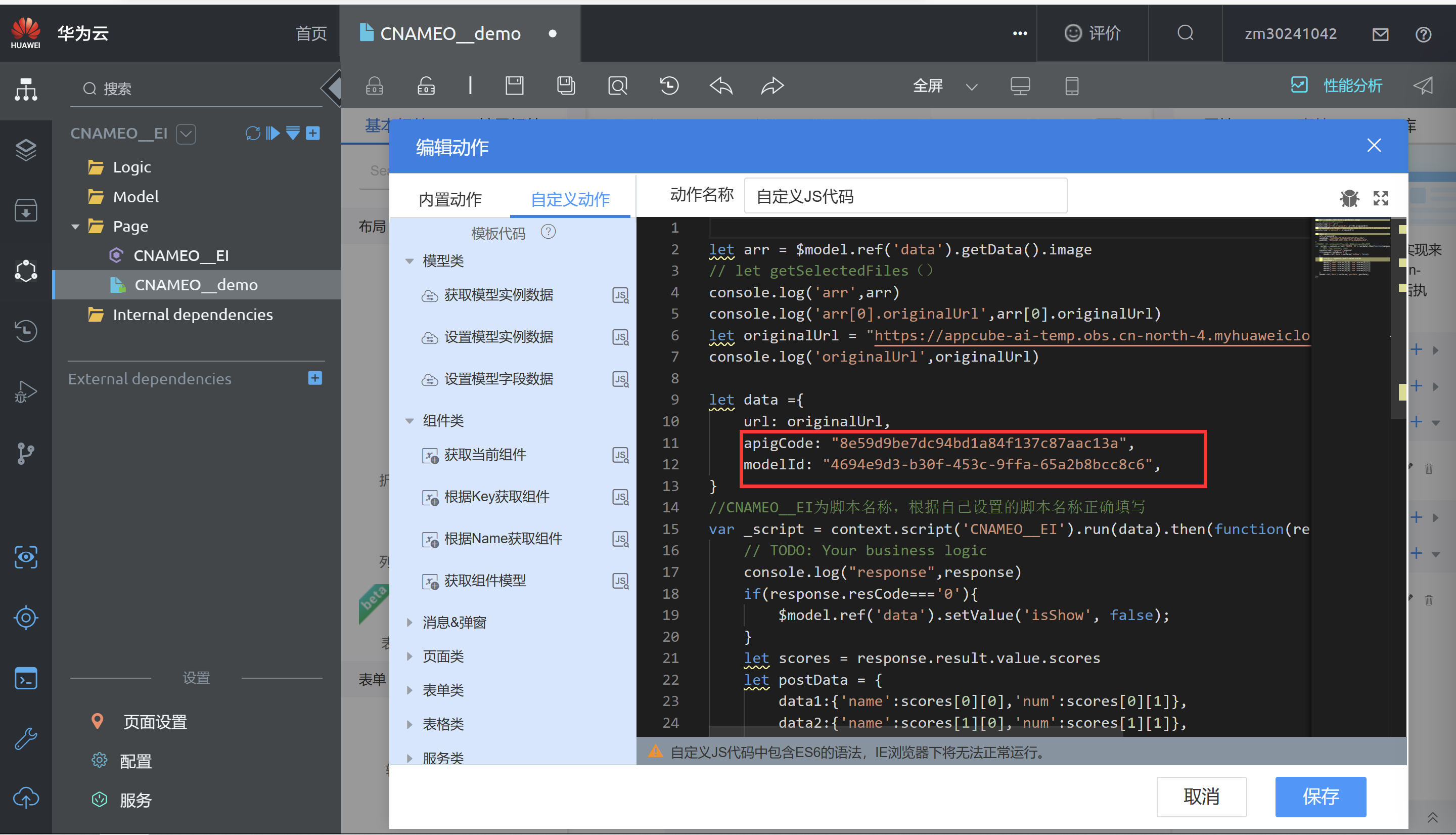 参考下图红框区域,将代码中的 apigCode 和 modelId 对应的值替换为你在第1章《AI Gallery 模型订阅及部署》中部署的在线服务 API 接口中的参数(同第5章连接器中的测试时填写的参数),替换后记得点击保存。