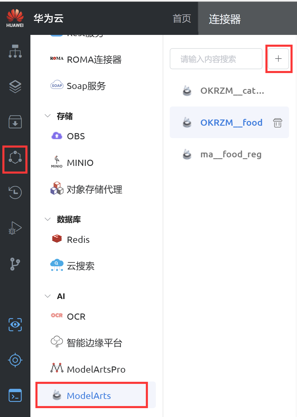 点击刚刚导入的“EI”项目后会进入应用编辑页面,点击左侧的第四个“连接器”菜单, 在“AI”分类下找到 ModelArts 选项,然后点击右侧的“+”号,新建一个连接器。