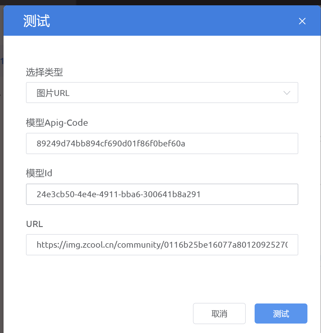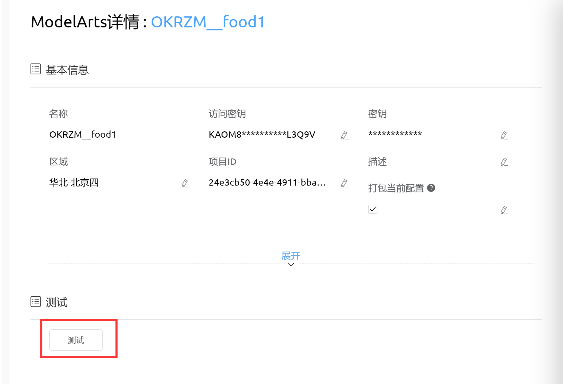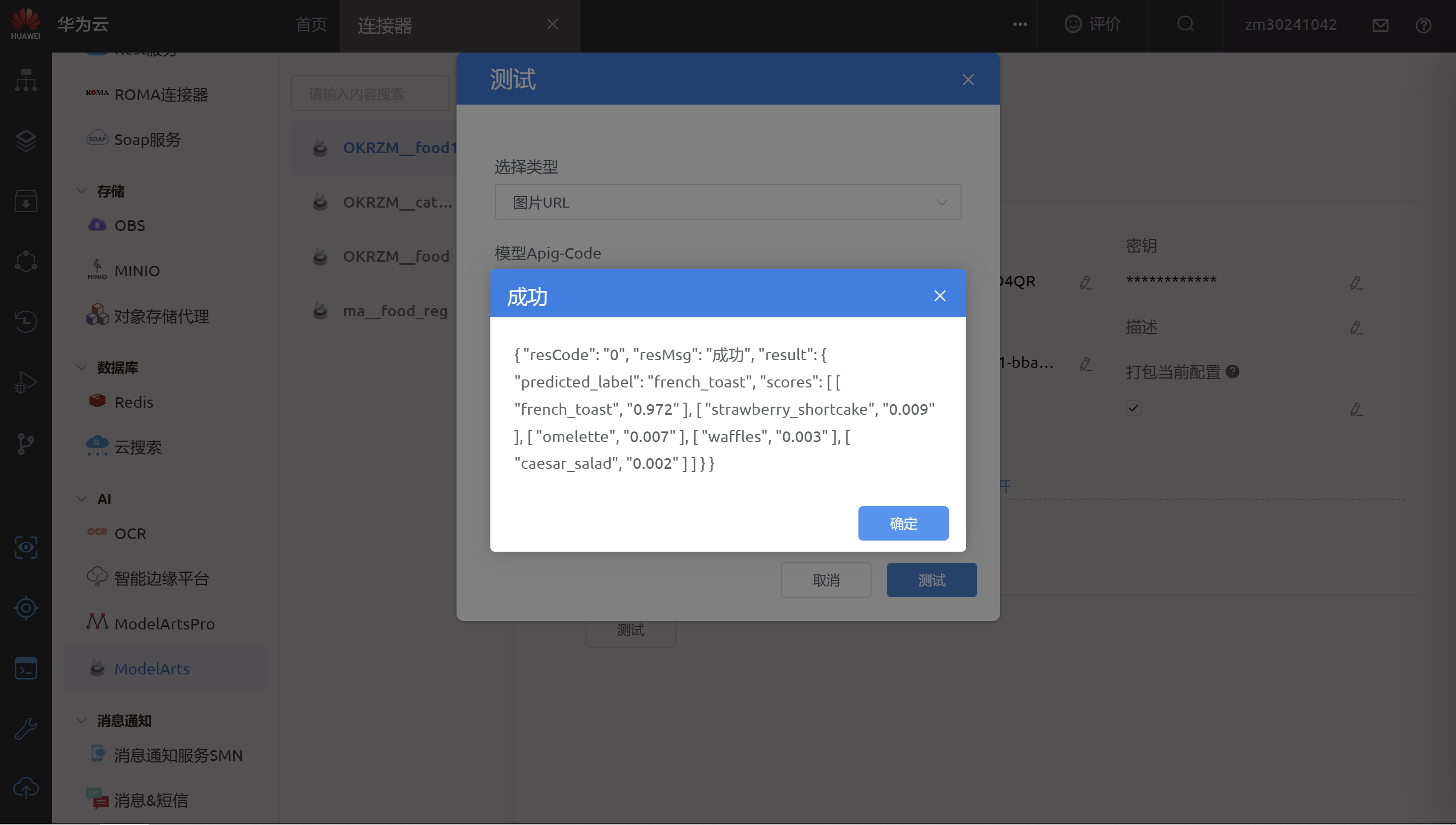 填写完成后点击测试,如果成功即可获得 ModelArts 服务接口返回的JSON返回值,如下图:
