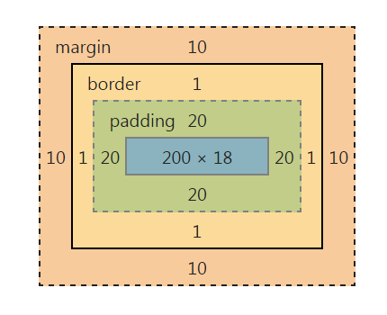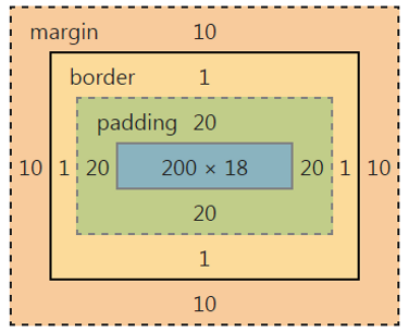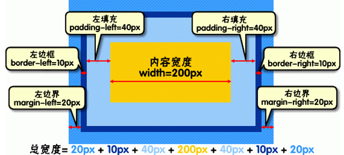 因此一个元素实际宽度(盒子的宽度)=左边界+左边框+左填充+内容宽度+右填充+右边框+右边界。