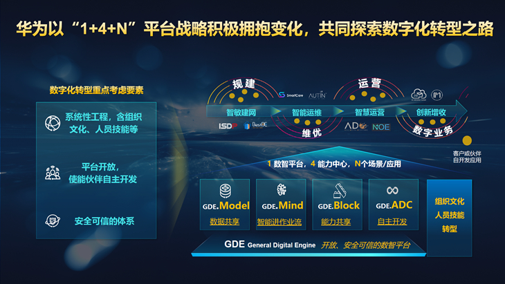 为应对数字化转型的趋势和挑战,华为发布了“1+4+N”的平台战略——GDE数智平台,来帮助电信运营商们积极拥抱变化。