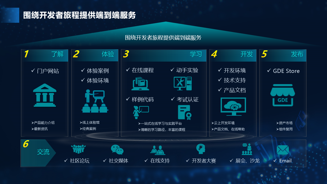 为了帮助开发者快速的了解我们平台能力,并且在学习、开发、发布等阶段都能够获得足够的支持,我们围绕整个开发旅程提供了端到端的服务,。同时在开发完应用之后,我们也提供了相应的社区沙龙、开发者大赛、社区活动等,让大家有展示自己的机会。