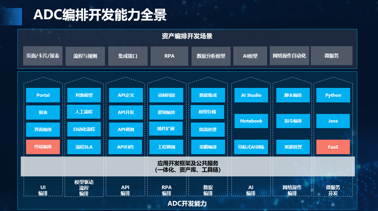 GDE.ADC是个一体化全场景的开发平台,提供八大编排能力:UI编排、流程编排、集成编排、数据编排、RPA编排、AI编排、网络操作编排、函数编排。多技术一体化编排使得各类技术编排无缝集成,可跨域资产统一编排。