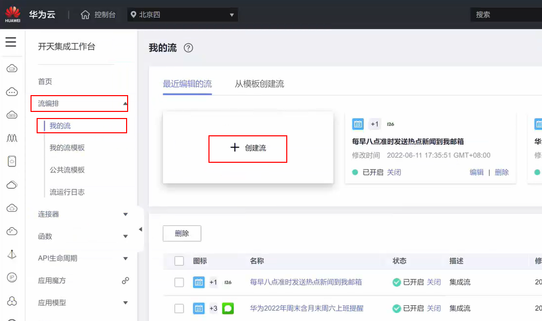 流编排->我的流->创建流,在添加执行动作->内置中选择API流。API请求方式选择GET,API认证方式选择无认证,填写API后端IAM认证信息。在API请求体架构中,填写刚刚下载好的心知天气连接器文件中的参数。