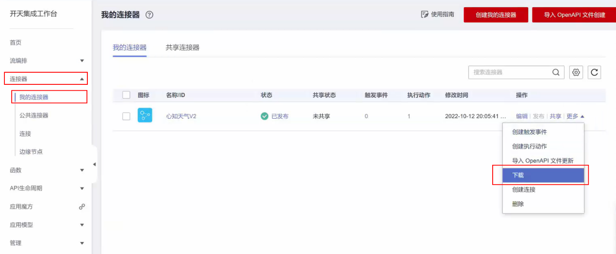 提前准备:在连接器->我的连接器中,下载4.1中已创建好的心知天气连接器。