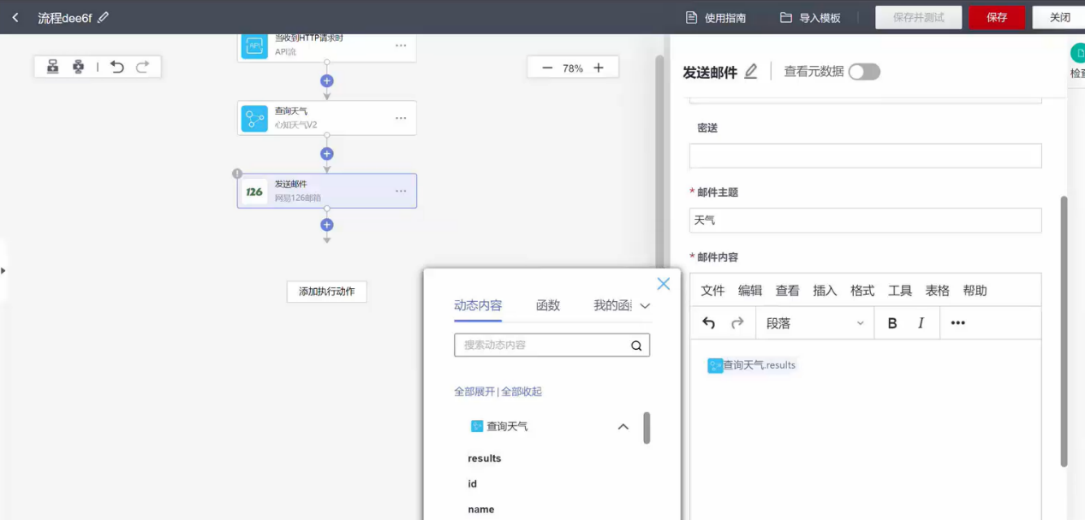 选择保存并测试,查看流的运行状态。这样,我们就完成了一个每天早上8点自动发送天气预报邮件的小工具。