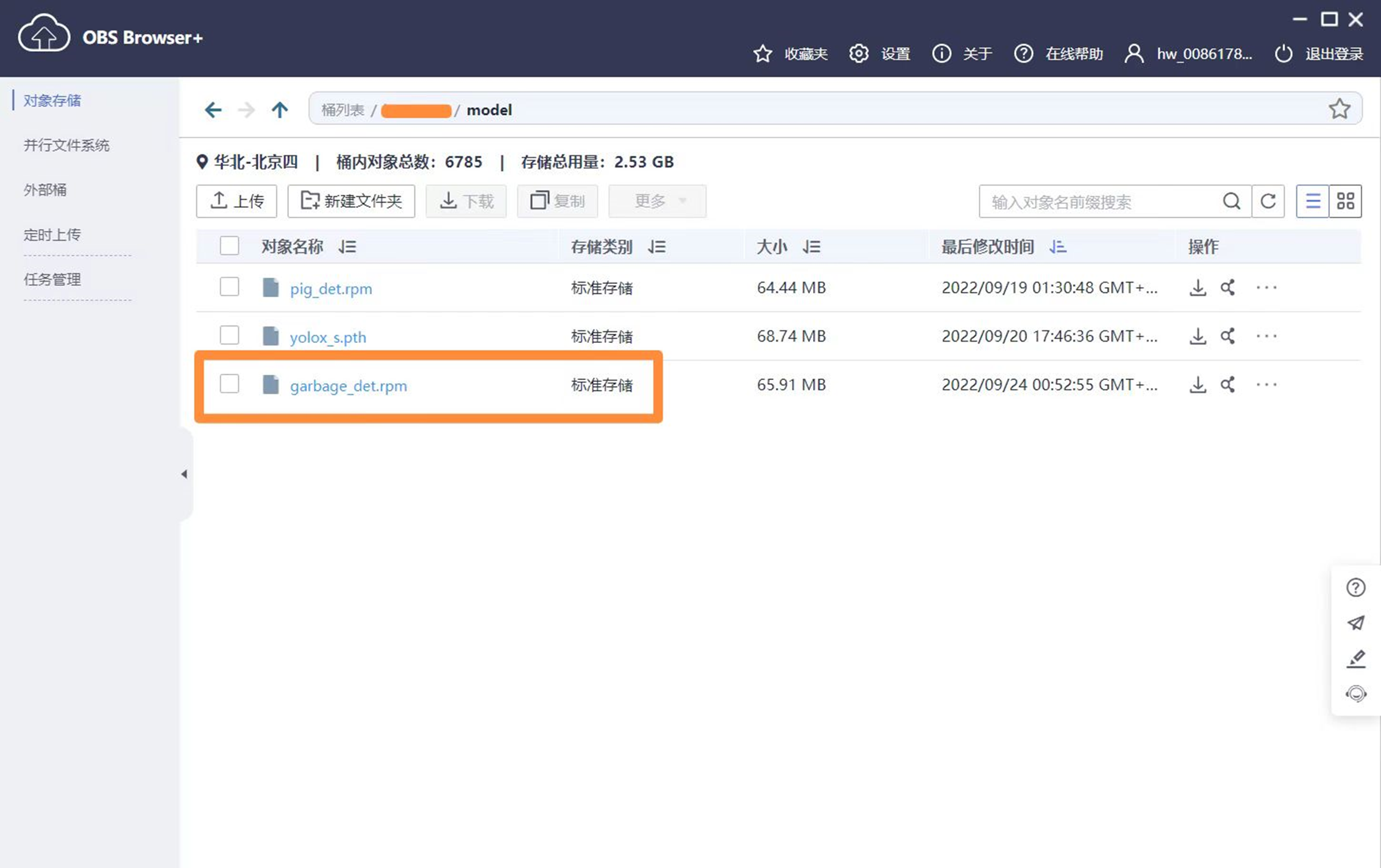 将打包好的应用上传至华为云账号下的obs桶中: