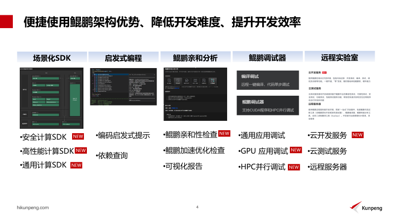 目前,鲲鹏亲和开发框架提供:场景化SDK、启发式编程、鲲鹏亲和分析、鲲鹏调试器、远程实验室等功能,降低开发应用难度,方便开发者使用鲲鹏架构提供的软硬协同能力,提升开发效率。
