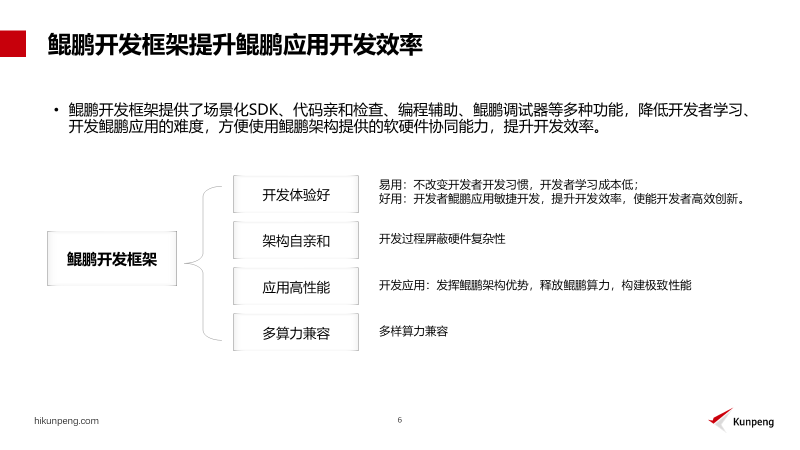 鲲鹏开发框架主要是提供给开发者:开发体验好、架构自亲和、应用高性能、多算力兼容的框架,降低开发者学习和开发鲲鹏应用的难度。