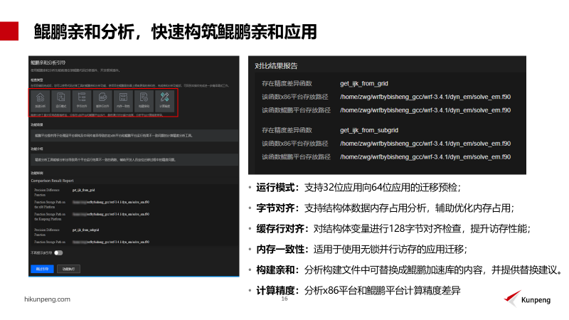 鲲鹏亲和开发框架提供鲲鹏亲和分析的功能,帮助开发阶段使用更高效鲲鹏加速库,检查应用软件的鲲鹏亲和性,更高效的使用鲲鹏算力。