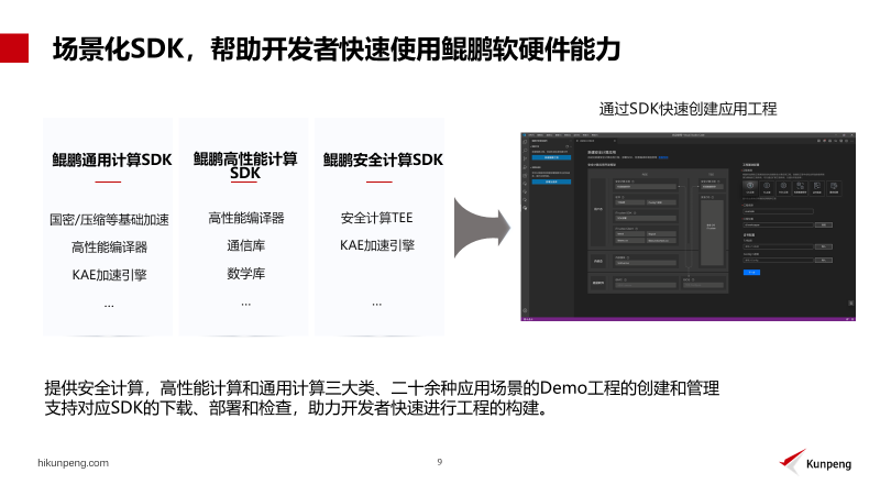 场景化SDK包括:提供安全计算,高性能计算和通用计算三大类,以及二十余种应用场景的Demo工程的创建和管理支持对应SDK的下载、部署和检查,零成本学习鲲鹏开发框架,助力开发者快速进行工程构建。